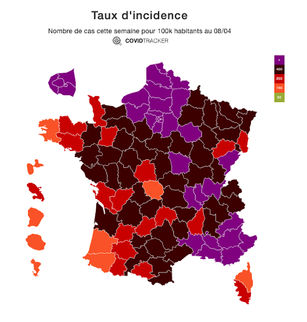 La nouvelle carte des taux d'incidence par départements montre la propagation de l'épidémie de la Covid-19 en France, avec des taux records. On notera les hausses très rapides dans les départements où les "Parisiens" sont allés se "réfugier" pour éviter "le confinement-qui-n'en-est-pas-un" A titre de comparaison, puisque les Français aiment bien comparer (enfin, uniquement quand cela les arrange, soit pour se vanter soit pour mépriser soit pour trouver une excuse comme un gamin à l'école qui justifie sa mauvaise note en se comparant à ses camarades qui ont eu la même ou une plus mauvaise, démarche assez symptomatique d'une immaturité psychologique signe d'une certaine carence ou déficit de mentale, non ?), le taux d'incidence en moyenne nationale en Allemagne est de 108 contre 313 en France... et c'est parce que le taux a dépassé le seuil de 100 que le gouvernement allemand a maintenu et renforcé les restrictions. Le confinement allemand que méprisent Macron et son gouvernement a permis de contenir l'épidémie avec un seuil d'incidence contenu dans une marge entre 50 et 100. Il a permis de réduire considérablement le nombre de morts. Lundi 23 avril 2021, l'Allemagne déplorait 75 255 décès (rapportés à une population globale de 83 millions d'habitants) contre 92 935 en France (mais rapportés à une population beaucoup plus réduite, de 67 millions d'habitants - c'est bizarre, mais le gouvernement français, et certains "journalistes" oublient toujours de relativiser les chiffres en rapportant le nombre de morts à la population globale, mais bon, c'est vrai que les Français aiment bien comparer les chiffres... quand ça les arrange, quitte aussi à les entendre à leur manière pour leur faire dire ce qu'ils veulent, par omission.